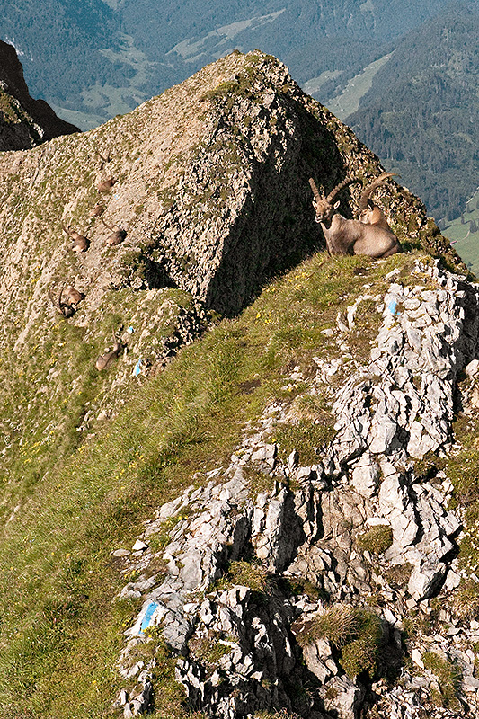 Die am Verbindungsgrat zum Jöchli liegenden Steinböcke waren bereits am frühen Morgen vom Rotsteinpass her auszumachen. Informationen zum Tier: Art: Alpensteinbock (Capra ibex). |