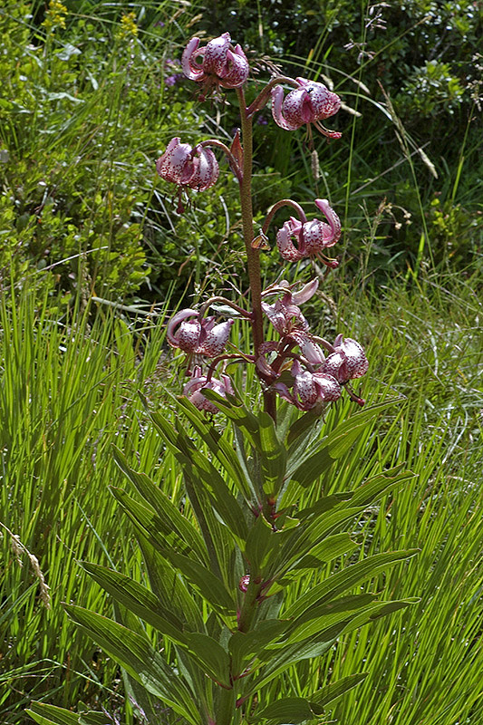 Die Blüten des Türkenbunds welken bereits ... Informationen zur Pflanze: Art: Türkenbund (Lilium martagon). Verbreitung: Portugal bis sibirische Taiga, südlich über den Balkan bis zum Kaukasus, Mongolei, China, Japan. Regionale Verbreitung Alpen: In Höhen bis 2000 m, zerstreut. Vorkommen: Nährstoff- und kalkreiche, humose, lockere Böden mit guter Wasserführung - Laub- und Mischwälder, Gebüsche, Waldränder. Wuchshöhe: 30 - 120 cm. Blüte: Juni - August. |
