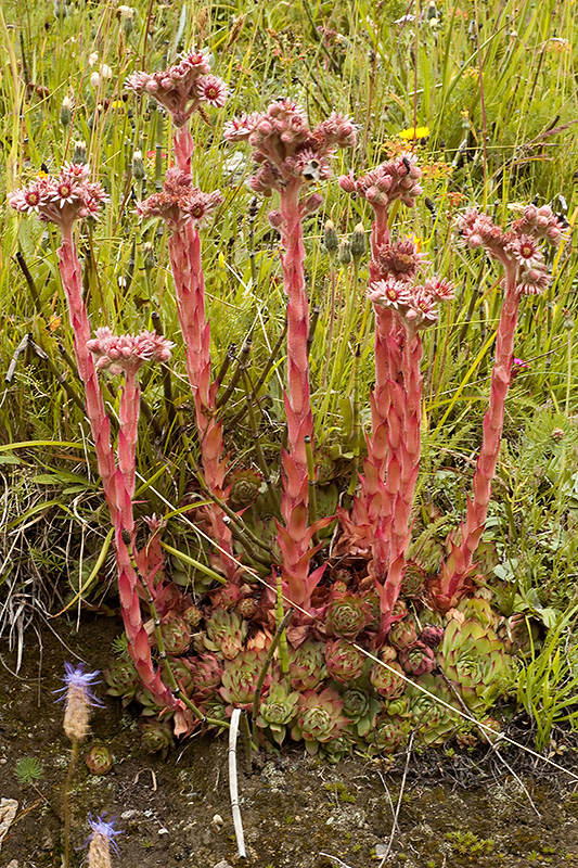 Die Echte Hauswurz steht in voller Blüte. Diese Art wurde in früheren Zeiten gerne auf Dächern angepflanzt, da sie als Zauberpflanze im Ruf stand, Blitzschlag abwehren zu können. |
