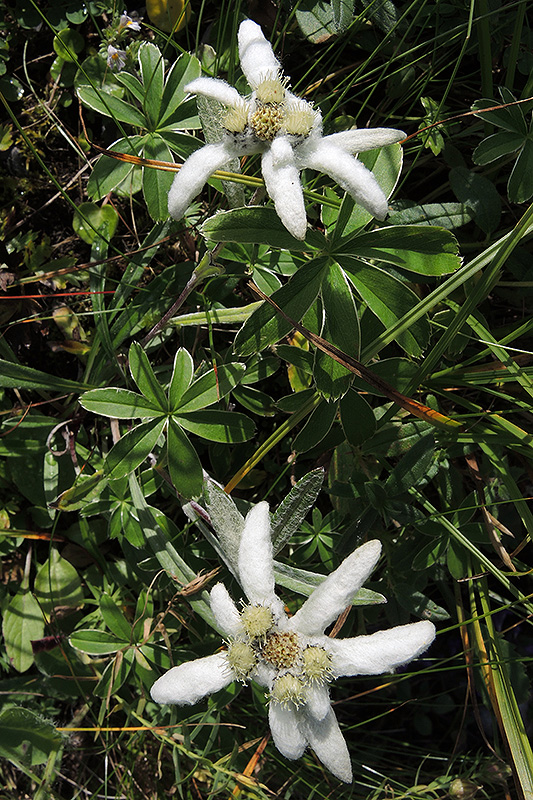 Edelweiss blühen in den steilen Grasplanken. Informationen zur Pflanze: Art: Edelweiss (Leontopodium alpinum). Verbreitung: Alpen, Jura, Karpaten, nördlicher Balkan, nördlicher Apennin, Pyrenäen, Abruzzen, Dinarisches Gebirge und Pirin-Gebirge. Regionale Verbreitung Alpen: In Höhen zwischen 1800 und 3000 m. In Ketten mit kristallinem Gestein vereinzelt, in Ketten mit Kalk selten. Vorkommen: Nährstoffreiche Böden - Rasen, sonnige Steilhänge, Felsspalten, Schutt. Wuchshöhe: 5 - 20 cm. Blüte: Juli - September. |