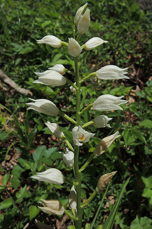 Die reinweissen Blüten des Langblättrigen Waldvögeleins öffnen sich meist nur bis zur Hälfte. Informationen zur Pflanze: Art: Langblättriges Waldvögelein (Cephalanthera longifolia). Verbreitung: Mitteleuropa bis Nordafrika, östlicher Mittelmeerraum. Regionale Verbreitung Alpen: Kalkalpen in Höhen bis 1400 m, selten und über weite Strecken fehlend. Vorkommen: Warme, lockere, humusdurchsetzte, kalk- oder basenhaltige Böden - lichte Laub- und Mischwälder, Trockengebüsche, Kiefernbestände, halbschattige Bergwiesen und Waldblössen. Wuchshöhe: 20 - 60 cm. Blüte: Mai - Juni. |