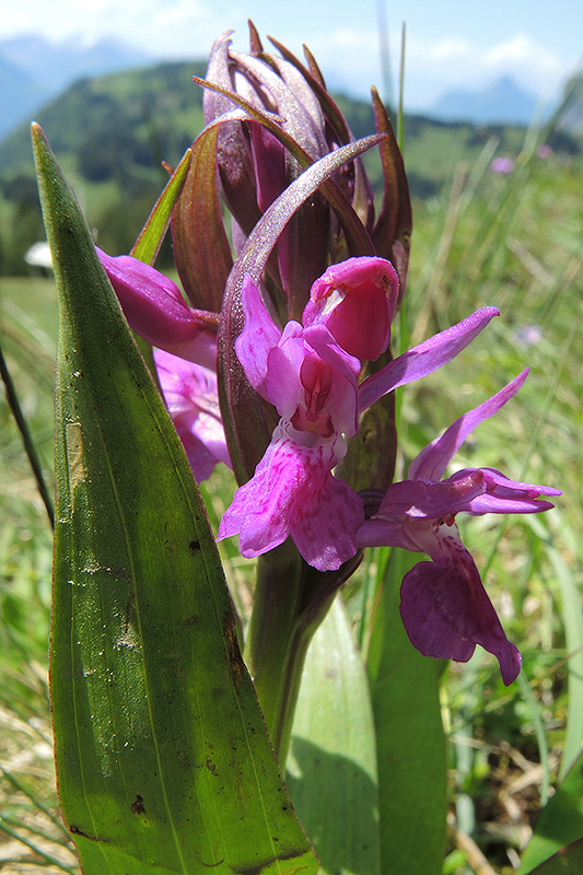 Der Blütenstand aus der Nähe betrachtet. Informationen zur Pflanze: Art: Breitblättrige Fingerwurz (Dactylorhiza majalis). Verbreitung: Europäisch, südlich von Nord-Spanien über Nord-Italien und Dalmatien bis Rumänien, nördlich bis Südschweden und Südnorwegen, östlich bis Sibirien. Regionale Verbreitung Alpen: In Höhen bis über 2000 m, zerstreut, stellenweise häufig. Im Jura zerstreut, im Flachland selten. Vorkommen: Mässig kalkhaltige, nährstoffreiche, mindestens frühjahrsnasse, unbeschattete, sonnige Böden - Feuchtwiesen, Flachmoore, Quellmulden, Bäche, Gräben, lichte Auenwälder. Wuchshöhe: 15 bis 40 cm. Blüte: Mai - August. |