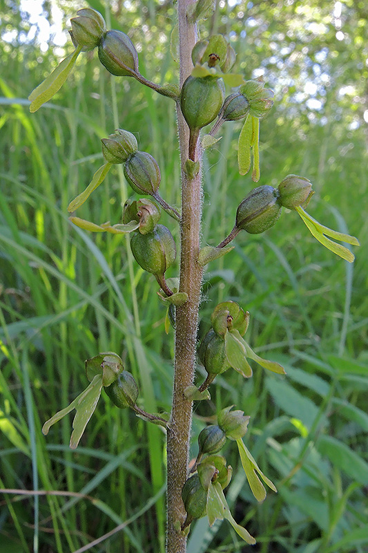 Auch das Grosse Zweiblatt blüht im Schatten der Gebüsche. Sie ist die wohl verbreitetste Orchideenart der Schweiz. Informationen zur Pflanze: Art: Grosses Zweiblatt (Neottia ovata, Syn. Listera ovata). Verbreitung: Eurasiatisch, westwärts bis Island, England und Spanien, südwärts bis Sizilien, Kreta und die Türkei, ostwärts bis in den Altai und Nordwesthimalaya. Regionale Verbreitung Alpen: In Höhen bis 1500 m, häufig. Über 2000 m nur noch ganz vereinzelt. Vorkommen: Basenreiche, kalkhaltige, durchfeuchtete Ton- oder Lehmböden - Wälder, feuchte Wiesen, Flachmoore, wechselfeuchte Halbtrockenrasen. Wuchshöhe: 20 - 65 cm. Blüte: Mai - Juni, Blütenlippe bis 1 cm lang. |