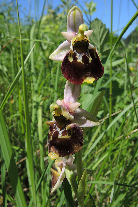 Wichtigster Bestäuber der Hummel-Ragwurz ist die Bienenart Eucera longicornis, deren Sexuallockstoff (Insektenpheromone) die Blüte nachahmt. Sie kopiert zudem einige optische und taktile Schlüsselreize. Informationen zur Pflanze: Art: Hummel-Ragwurz (Ophrys holoserica). Verbreitung: Europäisch, mediterran, submediterran, nördlich bis Südengland, West- und Mitteldeutschland, Nordbayern, Südostösterreich. Regionale Verbreitung Alpen: Nördliche Kalkalpen in Höhen bis 1000 m, südliche Kalkalpen bis 1500 m, selten. Vorkommen: Tiefgründige, humusreiche Kalk- oder Lössböden - Magerwiesen, Halbtrocken- und Trockenrasen, grasige Dämme, buschige Hänge, lichte Föhren-Eichenwälder, trockenere Stellen von Feuchtwiesen. Wuchshöhe: 10 bis 30 cm. Blüte: Mai - Juli, Länge Sepalen (äussere Blütenblätter, Kelchblätter) 10 - 14 mm, Petalen (innere Blütenblätter, Kronblätter) 3 - 6 mm, Lippe 8 - 12 mm lang und 12 - 18 mm breit. |