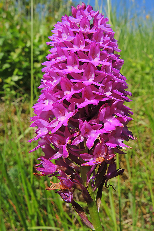 Die Morgensonne leuchtet die vielen Blüten herrlich aus. Informationen zur Pflanze: Art: Spitzorchis (Anacamptis pyramidalis). Verbreitung: Europäisch, nordwärts bis Skandinavien, südwärts bis Nordafrika, im Westen von der Iberischen Halbinsel bis West- und Südwest-Russland, Kleinasien und Iran im Osten. Regionale Verbreitung Alpen: Juraketten, Alpen in Höhen bis 1500 m, selten. Vorkommen: Humus- und kalkreiche, lockere, eher steinige Lehmböden, saure Torfböden, lockerer Löss - Magerwiesen, Halbtrocken- und Trockenrasen, lichte Föhren- und Eichenwälder, Strassenböschungen, Ränder von Feuchtwiesen. Wuchshöhe: 20 bis 50 cm. Blüte: Mai - Juli. |