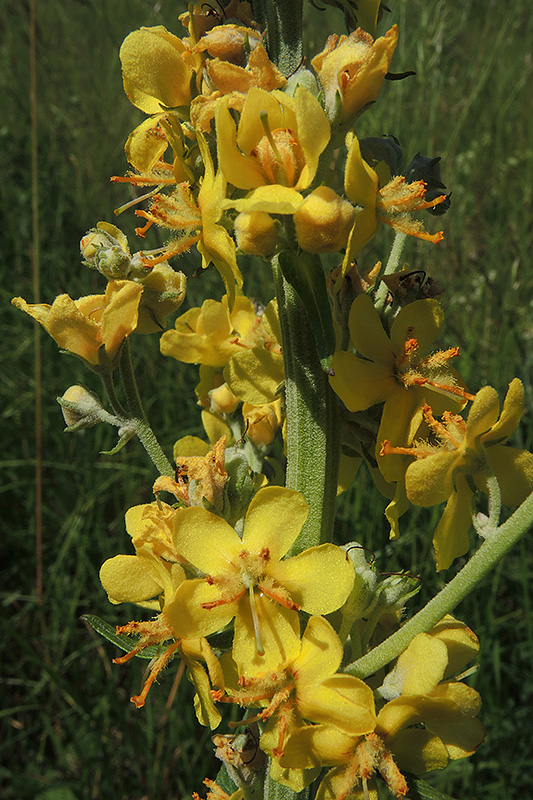 Der Blütenstand aus der Nähe betrachtet. Informationen zur Pflanze: Art: Grossblütige Königskerze (Verbascum densiflorum). Verbreitung: Europäisch-westasiatisch. Regionale Verbreitung Alpen: In Höhen bis 1900 m. Vorkommen: Trockene bis frische, nährstoffreiche, steinige, kalkhaltige Böden - sonnige Unkrautfluren, Schuttplätze, Wegränder, Dämme, Ufer, Waldschläge. Wuchshöhe: 50 bis 120 cm. Blüte: Juni - September, Blüte 3.5 - 5 cm Durchmesser. |
