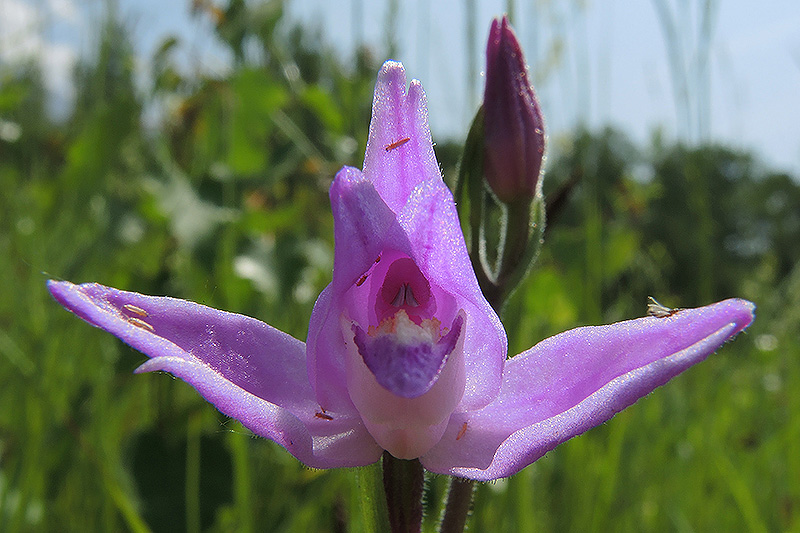 Eine Blüte aus der Nähe betrachtet. Informationen zur Pflanze: Art: Rotes Waldvögelein (Cephalanthera rubra). Verbreitung: Europäisch, Nordafrika, ostwärts bis zur Krim und zum Kaukasus. Regionale Verbreitung Alpen: Jura, nördliche Kalkalpen in Höhen bis 1500 m, selten, südliche Kalkalpen in Höhen bis 1600 m, zerstreut. Vorkommen: Kalkhaltige oder basenreiche, lockere, humose, nicht zu trockene Lehm- oder Tonböden mit guter Mullauflage - lichte Wälder, Waldwege, Wiesen am Waldrand, Gebüschhänge. Wuchshöhe: 20 - 70 cm. Blüte: Juni - Juli, Sepalen (äussere Blütenblätter, Kelchblätter) 16 - 23 mm lang, 6 - 7 mm breit, Petalen (innere Blütenblätter, Kronblätter) 15 - 20 mm lang, 7 - 10 mm breit, Lippe (Labellum) 15 - 20 mm lang. |