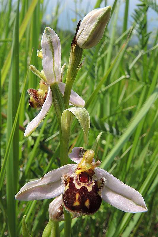 Die Anzahl blühender Pflanzen der Bienen-Ragwurz schwankt von Jahr zu Jahr - je trockener der Winter und Frühling, desto geringer die Anzahl. Informationen zur Pflanze: Art: Bienen-Ragwurz (Ophrys apifera). Verbreitung: Portugal bis Georgien, nordwärts bis England, südwärts bis Nordafrika und Vorderasien, mit Verbreitungsschwerpunkt mediterranes Südeuropa. Regionale Verbreitung Alpen: Jura, Kalkalpen in Höhen bis 1000 m, sehr selten. Vorkommen: Tiefgründige, lockere, kalkhaltige Böden - Halbtrockenrasen, Magerwiesen, Gebüsche, lichte Trockenwälder. Wuchshöhe: 15 bis 30 cm. Blüte: Mai - Juli, Länge Sepalen (äussere Blütenblätter, Kelchblätter) 13 - 16 mm, Petalen (innere Blütenblätter, Kronblätter) 3 - 4 mm, Lippe 8 - 12 mm lang und 7 - 9 mm breit. |