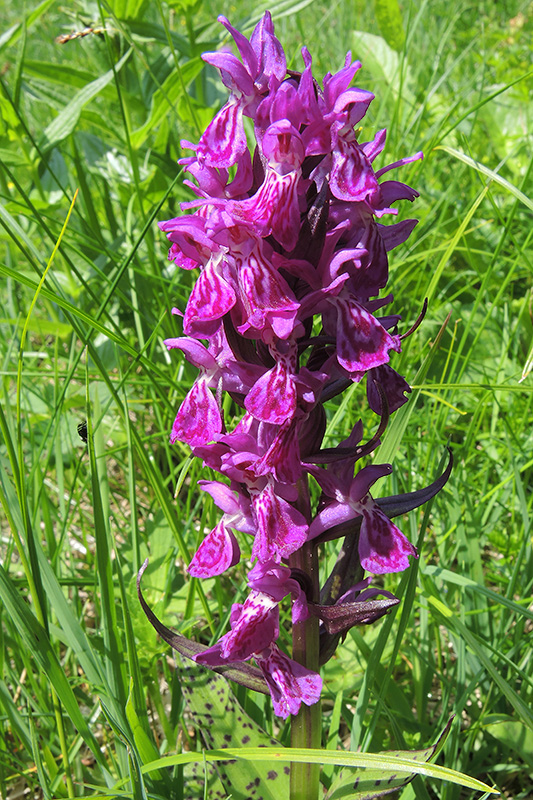 Der Breitblättrige Fingerwurz fasziniert mit seinen satten, leuchtenden Farben. Informationen zur Pflanze: Art: Breitblättrige Fingerwurz (Dactylorhiza majalis). Verbreitung: Europäisch, südlich von Nord-Spanien über Nord-Italien und Dalmatien bis Rumänien, nördlich bis Südschweden und Südnorwegen, östlich bis Sibirien. Regionale Verbreitung Alpen: In Höhen bis über 2000 m, zerstreut, stellenweise häufig. Im Jura zerstreut, im Flachland selten. Vorkommen: Mässig kalkhaltige, nährstoffreiche, mindestens frühjahrsnasse, unbeschattete, sonnige Böden - Feuchtwiesen, Flachmoore, Quellmulden, Bäche, Gräben, lichte Auenwälder. Wuchshöhe: 15 bis 40 cm. Blüte: Mai - August. |