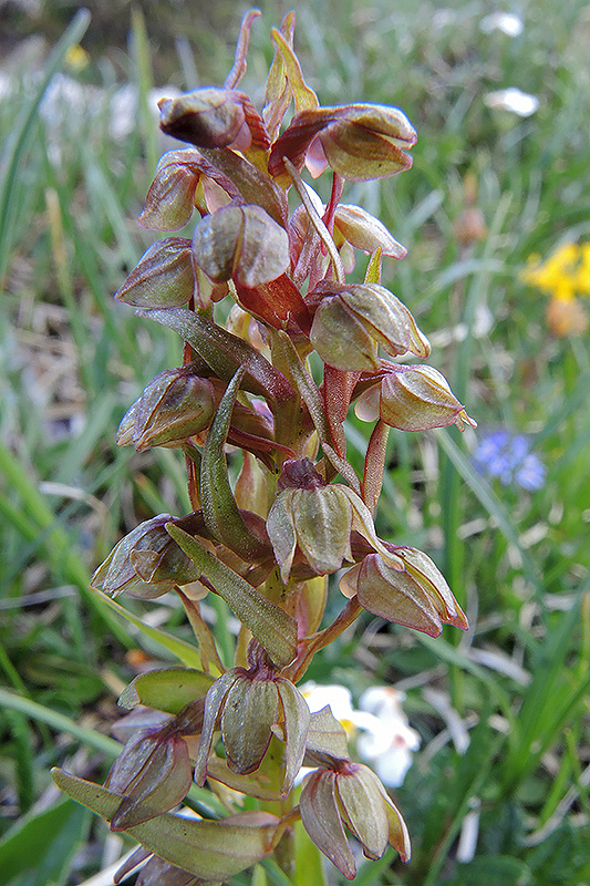 Am Gipfel eine Grüne Hohlzunge mit bräunlich überlaufenen Blüten. Informationen zur Pflanze: Art: Grüne Hohlzunge (Dactylorhiza viridis, Syn. Coeloglossum viride). Verbreitung: Auf der nördlichen Halbkugel von Nordamerika bis Ostasien, weite Teile Nord-, Mittel- und Südeuropas, besonders der Alpen- und Karpatenländer, der Türkei, der Krim und des Kaukasus. Regionale Verbreitung Alpen: In Höhen zwischen 1000 und 2500 Meter. In den Kalkalpen selten, in der Zentralkette zerstreut. Vorkommen: Versauerte, kalkarme, stark humusdurchsetzte, feuchte, aber nicht nasse Lehmböden - Magerrasen, Trocken- und Halbtrockenrasen, Sumpfwiesen, Schneetälchen, Zwergstrauchgebüsche, lichte Wälder. Wuchshöhe: 5 - 30 cm. Blüte: Mai - Juli, Länge Blütenlippe 5 - 10 mm. |