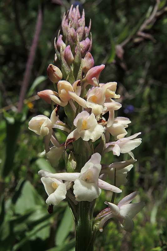 Unweit der Langspornigen Händelwurz zeigt auch bereits die Wohlriechende Händelwurz ihren Blütenstand. Informationen zur Pflanze: Art: Wohlriechende Händelwurz (Gymnadenia odoratissima). Verbreitung: Westwärts bis ins nördliche Spanien, nordwärts bis Mitteldeutschland, südliches Schweden und bis zum Baltikum, ostwärts bis Weissrussland und die Ukraine. Regionale Verbreitung Alpen: In Höhen bis 2500 m. In Kalkketten zerstreut, in der Zentralkette selten. Vorkommen: Kalkhaltige Böden - Magerrasen, Föhren- und Kiefernwälder, Feucht- und Nasswiesen, Flach- und Quellmoore. Wuchshöhe: 10 - 30 cm. Blüte: Juni - August. |