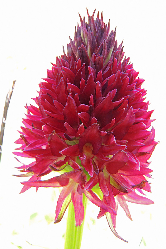 Die dichte, kugelig-eiförmige Blütenähre des Schwarzen Männertreus im Gegenlicht. Informationen zur Pflanze: Art: Schwarzes Männertreu (Gymnadenia rhellicani, Syn. Nigritella rhellicani). Verbreitung: Gebirge Mittel- und Südeuropas. Regionale Verbreitung Alpen: In Höhen zwischen 1000 und 2800 m, zerstreut. Vorkommen: Basen- und kalkreiche, kühle, gut mit Humus durchsetzte, lockere Lehmböden - ungenutzte alpine Matten, Magerrasen. Wuchshöhe: 5 - 25 cm. Blüte: Juni - August. |