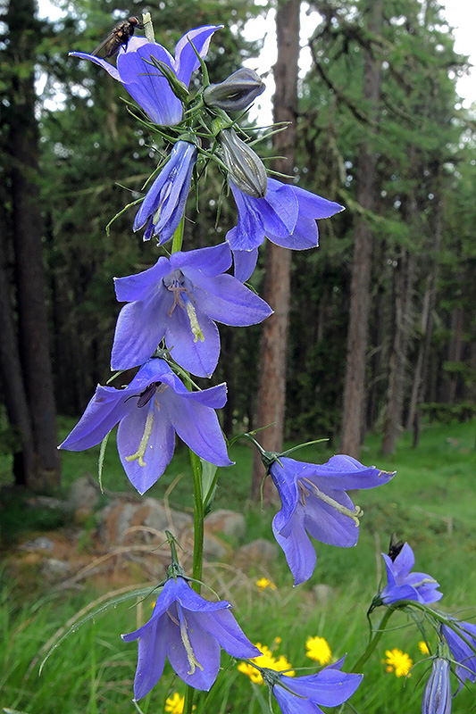 In einem lichten Waldstück blüht die Rautenblättrige Glockenblume. Informationen zur Pflanze: Art: Rautenblättrige Glockenblume (Campanula rhomboidalis). Verbreitung: Pyrenäen, im Jura und in den Westalpen nach Osten bis ins Vorder- und Hinterrheingebiet. Regionale Verbreitung Alpen: In Höhen von 500 bis 2300 m, selten. Vorkommen: Kalkhaltige, lehmige, nährstoffreiche Böden - feuchte Wiesen, Matten, Weiden. Wuchshöhe: 20 - 70 cm. Blüte: Juni - August, Blütenlänge 1 - 2 cm. |