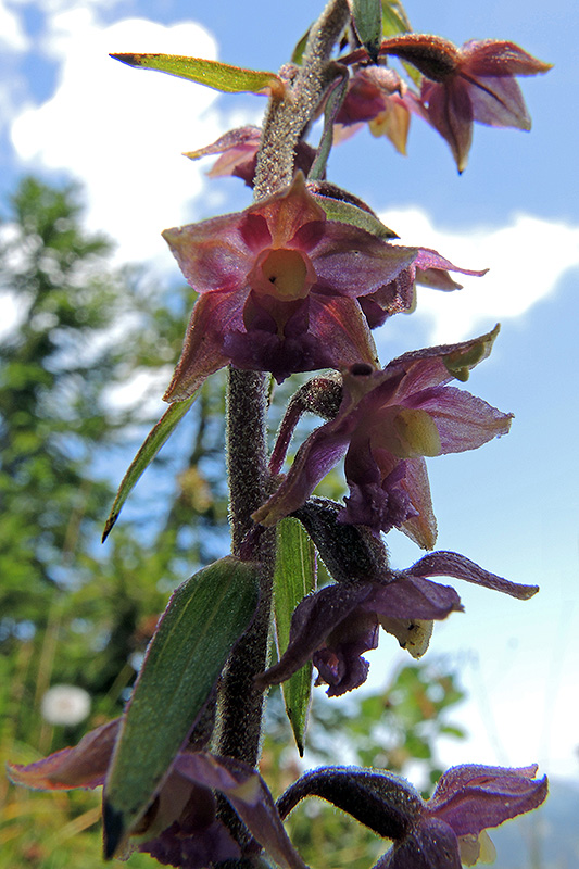 Die prächtigen Blüten der Braunroten Stendelwurz aus der Nähe gesehen. Informationen zur Pflanze: Art: Braunrote Stendelwurz (Epipactis atrorubens). Verbreitung: In Europa weit verbreitet, im Norden bis an die boreale, im Süden an die meridionale Zone, Richtung Osten bis Zentralsibirien und zum Kaukasus. Regionale Verbreitung Alpen: In Höhen bis 2600 m, zerstreut. Vorkommen: Kalkreiche, basisch bis neutrale, nährstoffarme, durchlässige, trockenwarme Sand- und Steinböden - helle Misch- und Nadelwälder, Säume, lichte Gebüsche, Brachland, Bahndämme, Halden, Zwergstrauchheiden von Dünen. Wuchshöhe: 20 - 80 cm. Blüte: Juni - August, Sepalen Länge 8 - 10 mm, Breite 3,5 - 5 mm, Petalen etwas kürzer und breiter, Hypochil Länge 4 - 6 mm. |