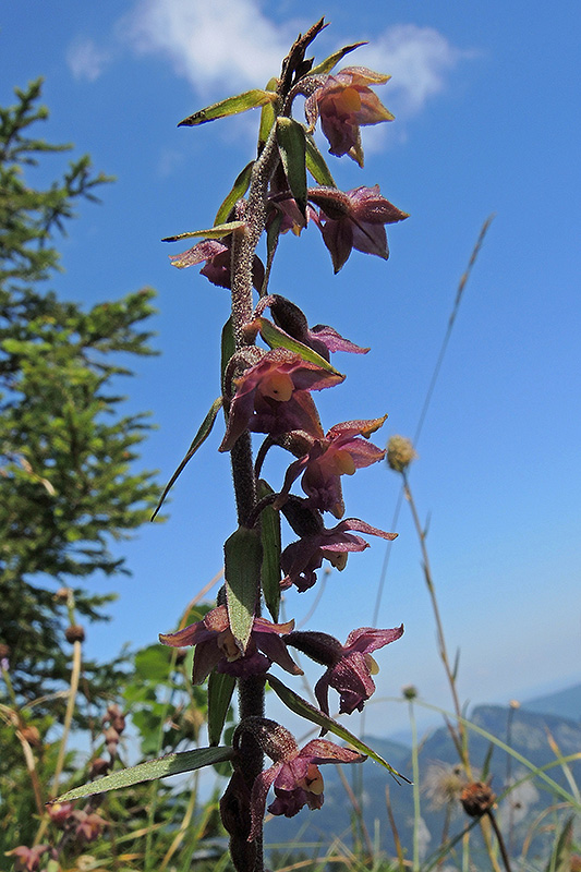 Die Blüten verströmen insbesondere bei warmem Wetter einen intensiven Vanilleduft. Im Verblühen duften sie auch nach Gewürznelken. Informationen zur Pflanze: Art: Braunrote Stendelwurz (Epipactis atrorubens). Verbreitung: In Europa weit verbreitet, im Norden bis an die boreale, im Süden an die meridionale Zone, Richtung Osten bis Zentralsibirien und zum Kaukasus. Regionale Verbreitung Alpen: In Höhen bis 2600 m, zerstreut. Vorkommen: Kalkreiche, basisch bis neutrale, nährstoffarme, durchlässige, trockenwarme Sand- und Steinböden - helle Misch- und Nadelwälder, Säume, lichte Gebüsche, Brachland, Bahndämme, Halden, Zwergstrauchheiden von Dünen. Wuchshöhe: 20 - 80 cm. Blüte: Juni - August, Sepalen Länge 8 - 10 mm, Breite 3,5 - 5 mm, Petalen etwas kürzer und breiter, Hypochil Länge 4 - 6 mm. |