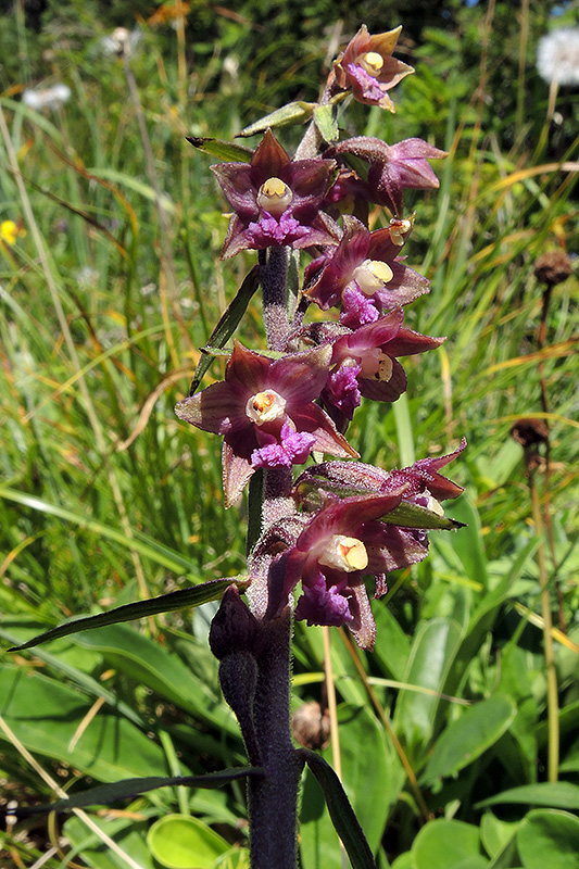 Die zygomorphen Blüten können bisweilen in ihrer Farbe variieren, sind in der Regel aber braunrot oder auberginefarben. Informationen zur Pflanze: Art: Braunrote Stendelwurz (Epipactis atrorubens). Verbreitung: In Europa weit verbreitet, im Norden bis an die boreale, im Süden an die meridionale Zone, Richtung Osten bis Zentralsibirien und zum Kaukasus. Regionale Verbreitung Alpen: In Höhen bis 2600 m, zerstreut. Vorkommen: Kalkreiche, basisch bis neutrale, nährstoffarme, durchlässige, trockenwarme Sand- und Steinböden - helle Misch- und Nadelwälder, Säume, lichte Gebüsche, Brachland, Bahndämme, Halden, Zwergstrauchheiden von Dünen. Wuchshöhe: 20 - 80 cm. Blüte: Juni - August, Sepalen Länge 8 - 10 mm, Breite 3,5 - 5 mm, Petalen etwas kürzer und breiter, Hypochil Länge 4 - 6 mm. |