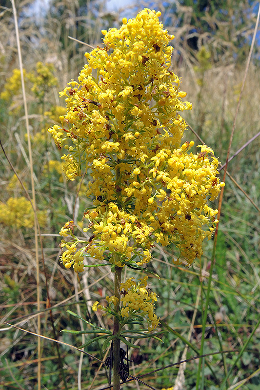 Ein stattliches Exemplar des Echten Labkrauts findet sich am Wegesrand. Informationen zur Pflanze: Art: Echtes Labkraut (Galium verum). Verbreitung: Eurasien. Regionale Verbreitung Alpen: In Höhen bis etwa 2000 m, zerstreut. Vorkommen: Steinige und kalkhaltige oder sandige und kalkarme, lockere, sonnig-warme, häufig südlich exponierte Böden - Matten, Halbtrockenrasen, warme Saumbereiche und Wegraine. Wuchshöhe: 15 - 70 cm. Blüte: Juni - Oktober. |