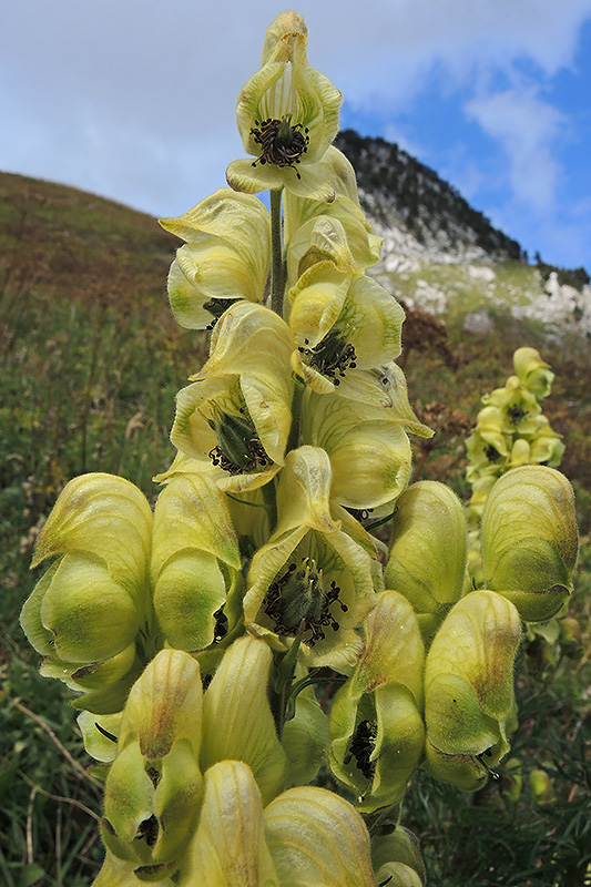 Ein Detailausschnitt des Blütenstandes. Das oberste Blütenblatt jeder Blüte bildet einen Helm, der ebenso breit wie hoch ist. Informationen zur Pflanze: Art: Giftheil-Eisenhut (Aconitum anthora). Verbreitung: Alpen, Spanische Gebirge, Pyrenäen, Corbières, Jura, Istrien, Kroatien, Ungarn, Mähren und Galizien. Regionale Verbreitung Alpen: Seealpen bis Grajische Alpen sowie südliche Kalkgebirge, in Höhen von 500 - 2200 m, selten. Vorkommen: Kalkhaltige Steinböden - trockene Weiden, steinige Rasen, felsige Hänge. Wuchshöhe: 30 - 100 cm. Blüte: Juli - September. |