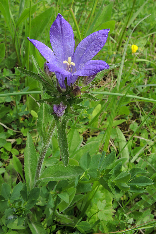 Die Blüten der Knäuel-Glockenblume stehen in einem dichten Knäuel am Ende des Stengels und in den oberen Blattachseln. Informationen zur Pflanze: Art: Knäuel-Glockenblume (Campanula glomerata). Verbreitung: Europa bis Kaukasus und Iran. Regionale Verbreitung Alpen: In Höhen zwischen 1000 und 1800 m. In Ketten mit Kalk, zerstreut. Vorkommen: Kalkhaltige, nährstoffreiche, steinig-lehmige Böden - Waldränder, Zwergstrauchheiden, trockene Wiesen, schüttere Matten. Wuchshöhe: 15 - 70 cm. Blüte: Mai - September, Blütenlänge 1.5 - 2.5 cm. |