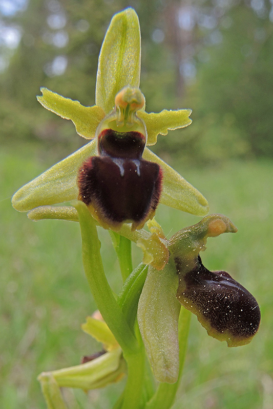 Spinnen-Ragwurzen sind die seltensten einheimischen Vertreter der Ragwurzen. Informationen zur Pflanze: Art: Kleine Spinnen-Ragwurz (Ophrys araneola). Verbreitung: Von Katalonien über Frankreich, Deutschland, Schweiz und Italien bis Dalmatien. Regionale Verbreitung Alpen: In Höhen bis 1200 m, selten. Vorkommen: Trockene, kalkhaltige Böden - Magerwiesen, Halbtrockenrasen, lichte Föhren- und Kiefernwälder. Wuchshöhe: 15 - 45 cm. Blüte: April - Mai, Länge Sepalen (äussere Blütenblätter, Kelchblätter) 10 mm, Petalen (innere Blütenblätter, Kronblätter) 6 - 8 mm, Lippe 6 - 9 mm lang und 7 - 11 mm breit. |