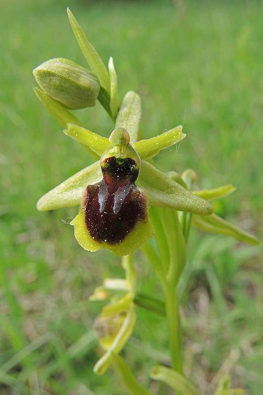 Das als Lippe bezeichnete mittlere Blütenhüllblatt ist von rötlichbrauner bis schwarzbrauner Farbe. Es ist meist mit einem deutlich ausgeprägten gelben Rand versehen. Informationen zur Pflanze: Art: Kleine Spinnen-Ragwurz (Ophrys araneola). Verbreitung: Von Katalonien über Frankreich, Deutschland, Schweiz und Italien bis Dalmatien. Regionale Verbreitung Alpen: In Höhen bis 1200 m, selten. Vorkommen: Trockene, kalkhaltige Böden - Magerwiesen, Halbtrockenrasen, lichte Föhren- und Kiefernwälder. Wuchshöhe: 15 - 45 cm. Blüte: April - Mai, Länge Sepalen (äussere Blütenblätter, Kelchblätter) 10 mm, Petalen (innere Blütenblätter, Kronblätter) 6 - 8 mm, Lippe 6 - 9 mm lang und 7 - 11 mm breit. |