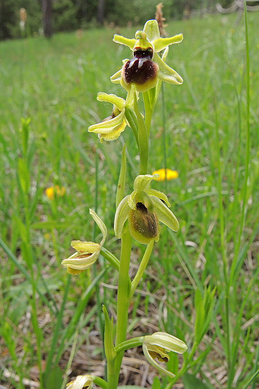 Zwei bis zwölf Blüten stehen locker in einem ährigen Blütenstand zusammen. Informationen zur Pflanze: Art: Kleine Spinnen-Ragwurz (Ophrys araneola). Verbreitung: Von Katalonien über Frankreich, Deutschland, Schweiz und Italien bis Dalmatien. Regionale Verbreitung Alpen: In Höhen bis 1200 m, selten. Vorkommen: Trockene, kalkhaltige Böden - Magerwiesen, Halbtrockenrasen, lichte Föhren- und Kiefernwälder. Wuchshöhe: 15 - 45 cm. Blüte: April - Mai, Länge Sepalen (äussere Blütenblätter, Kelchblätter) 10 mm, Petalen (innere Blütenblätter, Kronblätter) 6 - 8 mm, Lippe 6 - 9 mm lang und 7 - 11 mm breit. |