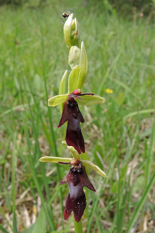 Eine Spinne hat den Blütenstand der Fliegen-Ragwurz erklommen. Informationen zur Pflanze: Art: Fliegen-Ragwurz (Ophrys insectifera). Verbreitung: Nord- und Mitteleuropäisch - Skandinavische Halbinsel, Finnland, Dänemark, Deutschland, Holland, Belgien, Britische Inseln ohne Schottland, Frankreich, nördliches Spanien, Italien, Schweiz, Österreich, Tschechien, Ungarn, Polen, Russland, Rumänien, Slowenien und Kroatien. Regionale Verbreitung Alpen: In Höhen bis 1600 m, ausnahmsweise bis 1800 m, zerstreut bis selten. Vorkommen: Kalkhaltige, lockere, lehmige oder tonige Böden - Magerwiesen, Halbtrockenrasen, Gebüsche, lichte Trockenwälder. Wuchshöhe: 15 - 40 cm. Blüte: Mai - Juli, Länge Sepalen (äussere Blütenblätter, Kelchblätter) 5 - 9 mm, Petalen (innere Blütenblätter, Kronblätter) 6 - 10 mm, Lippe 10 - 12 mm lang und 5 - 6 mm breit. |