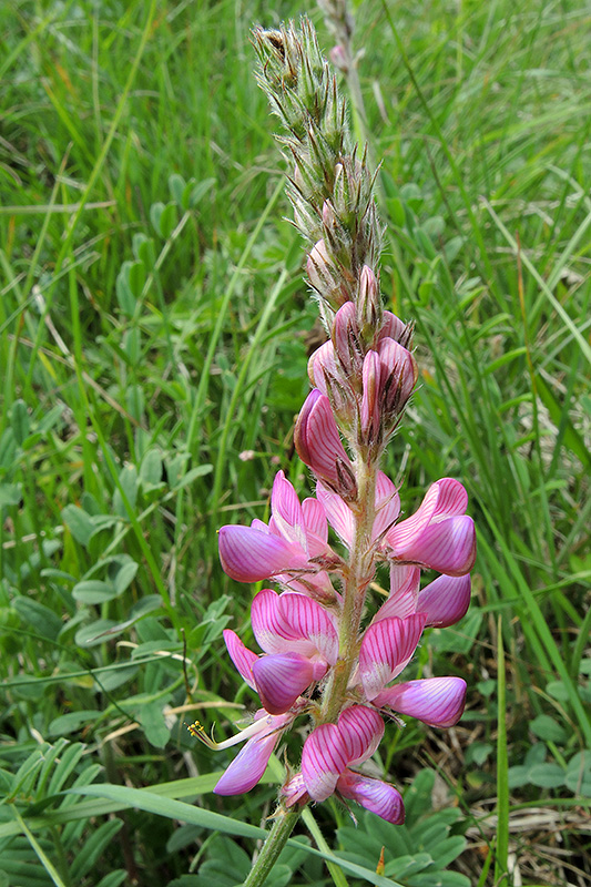 Ursprünglich stammt die Saat-Esparsette aus dem Mittelmeerraum, Südosteuropa und Sibirien. Sie wurde mit der Besiedlung von Mitteleuropa vom Menschen mitgebracht und gilt deshalb als ein eingebürgerter Archäophyt. Sie wurde zudem seit dem 18. Jahrhundert in Mitteleuropa als Futterpflanze angebaut und ist dadurch unbeständig verwildert. Informationen zur Pflanze: Art: Saat-Esparsette (Onobrychis viciifolia). Verbreitung: Europa und Westasien, in Amerika als Neophyt. Regionale Verbreitung Alpen: In Gebieten mit kalkarmem Gestein gebietsweise fehlend. Vorkommen: Warme, kalkreiche, mässig trockene, meist tiefgründige Lehm- und Lössböden - sonnige Kalk-Magerrasen, Halbtrockenrasen, lichte Trockengebüsche, Wegränder, Böschungen. Wuchshöhe: 30 - 90 cm. Blüte: Mai - August, Länge der Kronblätter 1 - 1,4 cm. |