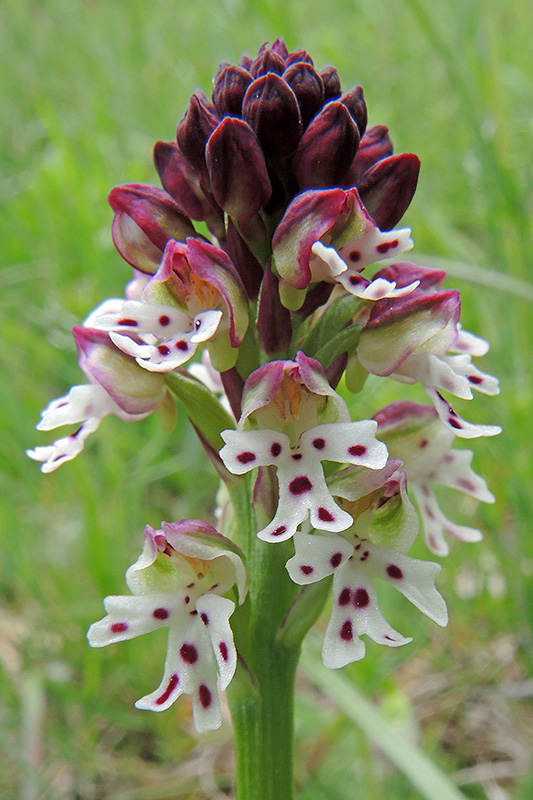 Die vielen sehr kleinen Blüten sind in einer walzenförmigen Ähre angeordnet, die sich im Verlauf der Blüte streckt. Informationen zur Pflanze: Art: Schwärzliches Knabenkraut (Neotinea ustulata, Syn. Orchis ustulata). Verbreitung: Von Nordspanien über Mitteleuropa, Südskandinavien, Osteuropa bis nach Mittelsibirien und zum Kaukasus, selten im Mittelmeerraum einschliesslich Nordafrika. Regionale Verbreitung Alpen: Auf der Alpennordseite in Höhen bis 1500 m, auf der Alpensüdseite bis 2000 m, verbreitet bis zerstreut. Vorkommen: Mässig trockene, meist kalkhaltige, magere, lockere, sommerwarme Böden - Streuwiesen, Magerwiesen, Trocken- und Halbtrockenrasen, Bergmatten. Wuchshöhe: 10 - 30 cm. Blüte: Mai - Juli, Durchmesser Helm 3 - 4 mm, Länge Lippe 5 - 8 mm. |