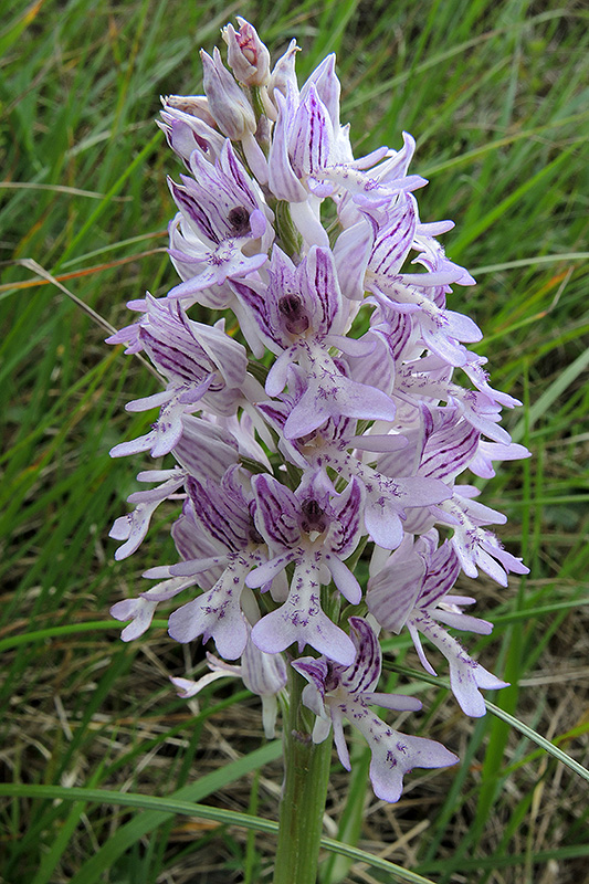 Am Rheindamm blühen farblich sehr helle Exemplare des Helm-Knabenkrauts. Informationen zur Pflanze: Art: Helm-Knabenkraut (Orchis militaris). Verbreitung: Eurasiatisch, submeridionale und temperate Florenzone. Europa nördlich bis Südschweden und Südfinnland, südlich über Mittelspanien und Mittelitalien bis Nordgriechenland, östlich bis Daurien und Kaukasien. Regionale Verbreitung Alpen: In Höhen bis 1800 m, in den Kalkalpen zerstreut, gebietsweise fehlend, auch auf Glimmerschiefer. Vorkommen: Trockene bis mässig frische, kalkhaltige Böden - Magerwiesen, Halbtrockenrasen, trockene Stellen in Riedwiesen, Buschwälder. Wuchshöhe: 20 - 50 cm. Blüte: Mai - Juni, Länge Lippe bis 2 cm. |