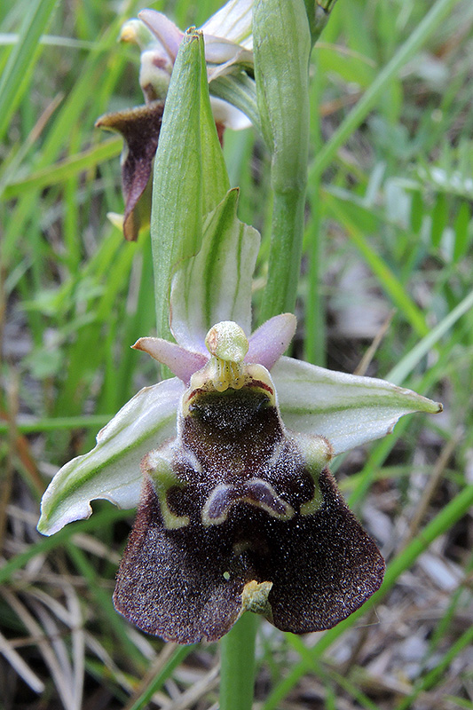 Da ich im Vergleich zum Vorjahr rund einen Monat früher fotografiere, ist die Hummel-Ragwurz im noch kargen Gras besser aufzuspüren. Informationen zur Pflanze: Art: Hummel-Ragwurz (Ophrys holoserica). Verbreitung: Europäisch, mediterran, submediterran, nördlich bis Südengland, West- und Mitteldeutschland, Nordbayern, Südostösterreich. Regionale Verbreitung Alpen: Nördliche Kalkalpen in Höhen bis 1000 m, südliche Kalkalpen bis 1500 m, selten. Vorkommen: Tiefgründige, humusreiche Kalk- oder Lössböden - Magerwiesen, Halbtrocken- und Trockenrasen, grasige Dämme, buschige Hänge, lichte Föhren-Eichenwälder, trockenere Stellen von Feuchtwiesen. Wuchshöhe: 10 bis 30 cm. Blüte: Mai - Juli, Länge Sepalen (äussere Blütenblätter, Kelchblätter) 10 - 14 mm, Petalen (innere Blütenblätter, Kronblätter) 3 - 6 mm, Lippe 8 - 12 mm lang und 12 - 18 mm breit. |