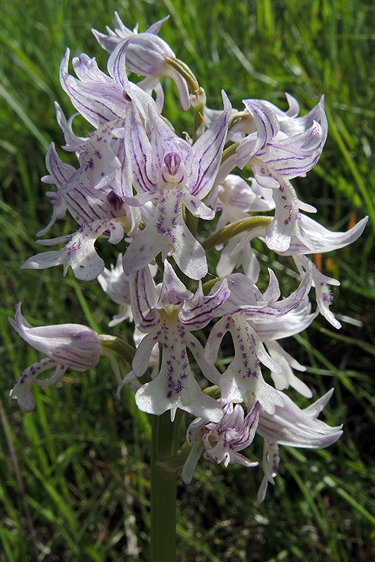 Das Helm-Knabenkraut mit seinen typisch geformten Blüten. Informationen zur Pflanze: Art: Helm-Knabenkraut (Orchis militaris). Verbreitung: Eurasiatisch, submeridionale und temperate Florenzone. Europa nördlich bis Südschweden und Südfinnland, südlich über Mittelspanien und Mittelitalien bis Nordgriechenland, östlich bis Daurien und Kaukasien. Regionale Verbreitung Alpen: In Höhen bis 1800 m, in den Kalkalpen zerstreut, gebietsweise fehlend, auch auf Glimmerschiefer. Vorkommen: Trockene bis mässig frische, kalkhaltige Böden - Magerwiesen, Halbtrockenrasen, trockene Stellen in Riedwiesen, Buschwälder. Wuchshöhe: 20 - 50 cm. Blüte: Mai - Juni, Länge Lippe bis 2 cm. |