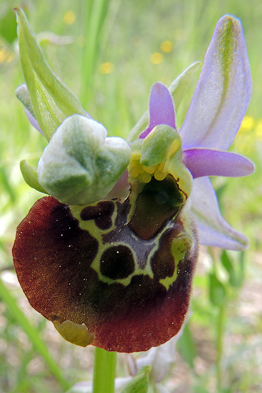 Eine offene Blüte mit noch geschlossener Blütenknospe linkerhand. Informationen zur Pflanze: Art: Hummel-Ragwurz (Ophrys holoserica). Verbreitung: Europäisch, mediterran, submediterran, nördlich bis Südengland, West- und Mitteldeutschland, Nordbayern, Südostösterreich. Regionale Verbreitung Alpen: Nördliche Kalkalpen in Höhen bis 1000 m, südliche Kalkalpen bis 1500 m, selten. Vorkommen: Tiefgründige, humusreiche Kalk- oder Lössböden - Magerwiesen, Halbtrocken- und Trockenrasen, grasige Dämme, buschige Hänge, lichte Föhren-Eichenwälder, trockenere Stellen von Feuchtwiesen. Wuchshöhe: 10 bis 30 cm. Blüte: Mai - Juli, Länge Sepalen (äussere Blütenblätter, Kelchblätter) 10 - 14 mm, Petalen (innere Blütenblätter, Kronblätter) 3 - 6 mm, Lippe 8 - 12 mm lang und 12 - 18 mm breit. |