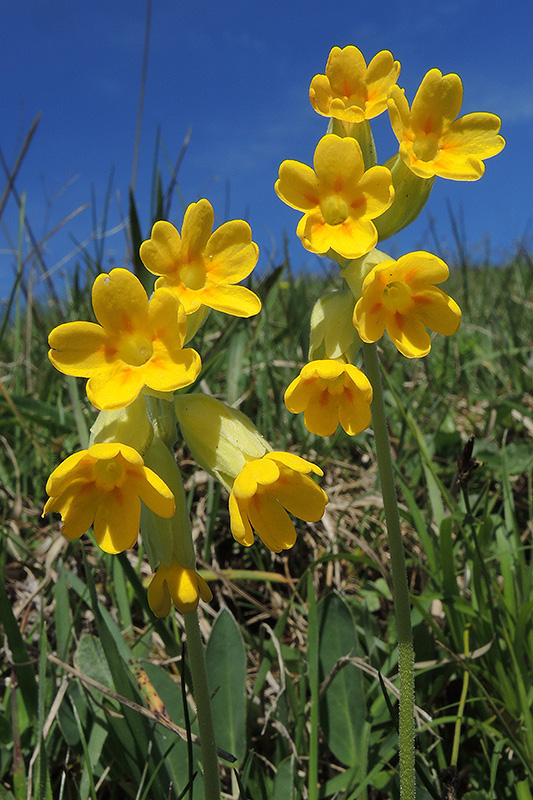 Die Blüten der Echten Schlüsselblume leuchten in sattem Gelb. Informationen zur Pflanze: Art: Echte Schlüsselblume (Primula veris). Verbreitung: Europa mit Ausnahme des Südens der Mittelmeerländer und des äussersten Nordens, Vorderasien. Regionale Verbreitung Alpen: In Höhen zwischen 500 und 2000 m. Fast ausschliesslich in den Kalkalpen, fehlt in grösseren Gebieten. Vorkommen: Kalk- und humusreiche, lockere, warme Böden - wenig gedüngte Weiden, Zwergstrauchheiden, lichte Laubwälder. Wuchshöhe: 15 - 30 cm. Blüte: März - April, Blütenlänge 0.8 - 2 cm. |