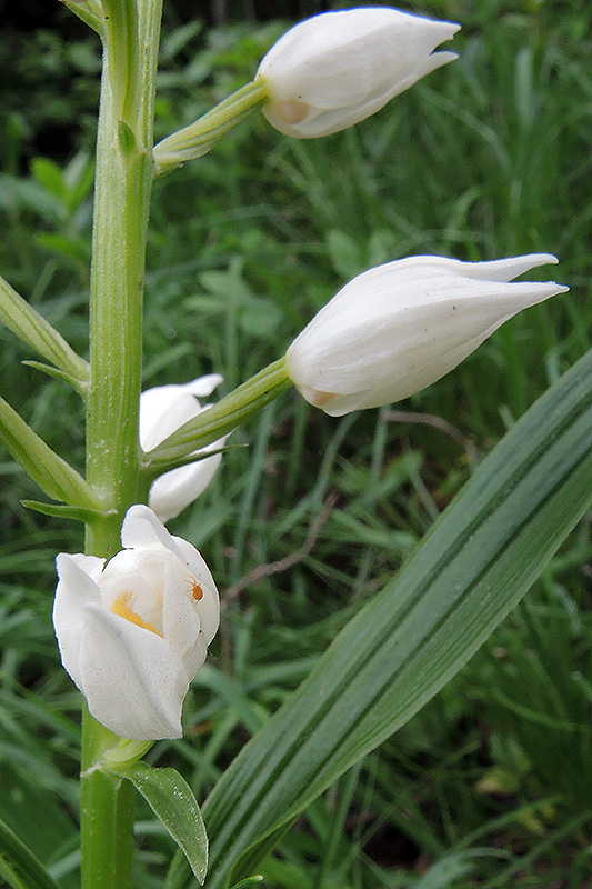 Die Blüten bleiben meist fast ganz geschlossen. Informationen zur Pflanze: Art: Weisses Waldvögelein (Cephalanthera damasonium). Verbreitung: Südeuropa bis Südskandinavien, östlich bis Vorderasien, Kaukasien und Westküste des Kaspischen Meeres. Regionale Verbreitung Alpen: In Höhen bis 1500 m, verbreitet bis zerstreut. Vorkommen: Lockere, kalkhaltige oder basenreiche, trockene bis frische Mullböden - lichter bis dunkler Laub-, Nadel- und Mischwald, halbschattig in Halbtrocken- und Trockenrasen. Wuchshöhe: 20 - 60 cm. Blüte: Mai - Juni. |