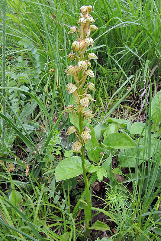 Der Ohnsporn gehört zu den unscheinbareren Arten der heimischen Orchideen. Informationen zur Pflanze: Art: Ohnsporn (Aceras anthropophorum). Verbreitung: Frankreich bis Südengland und Alpenländer, Nordafrika, Spanien, Balearen, gesamter Mittelmeerraum einschliesslich der Inseln bis zum Libanon. Regionale Verbreitung Alpen: Alpenvorland, Südalpen bis in Höhen von 1200 m, selten. Vorkommen: Warme, kalkreiche, trockenen bis mässig frische, lehmhaltige Böden - kurzgrasige Magerwiesen, Halbtrockenrasen, lichtes Gebüsch, im Windschutz von Hecken. Wuchshöhe: 20 - 30 cm. Blüte: Mai - Juni, Blütengrösse 1,2 - 1,4 cm. |