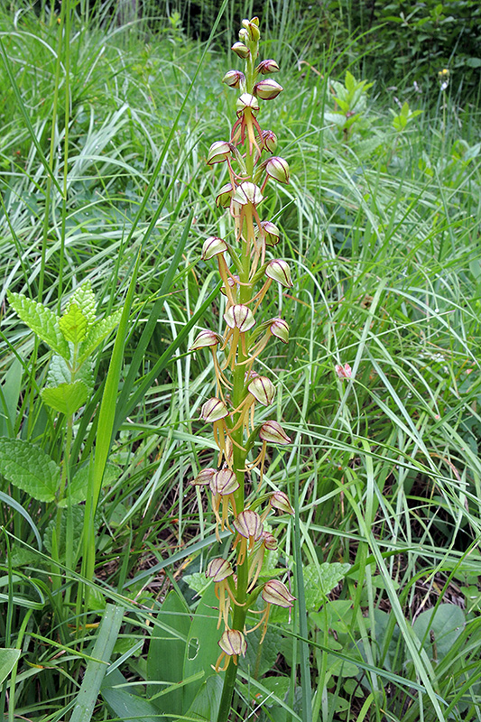 Die zierliche Pflanze wächst im Gras gut getarnt in Waldrandnähe. Informationen zur Pflanze: Art: Ohnsporn (Aceras anthropophorum). Verbreitung: Frankreich bis Südengland und Alpenländer, Nordafrika, Spanien, Balearen, gesamter Mittelmeerraum einschliesslich der Inseln bis zum Libanon. Regionale Verbreitung Alpen: Alpenvorland, Südalpen bis in Höhen von 1200 m, selten. Vorkommen: Warme, kalkreiche, trockenen bis mässig frische, lehmhaltige Böden - kurzgrasige Magerwiesen, Halbtrockenrasen, lichtes Gebüsch, im Windschutz von Hecken. Wuchshöhe: 20 - 30 cm. Blüte: Mai - Juni, Blütengrösse 1,2 - 1,4 cm. |