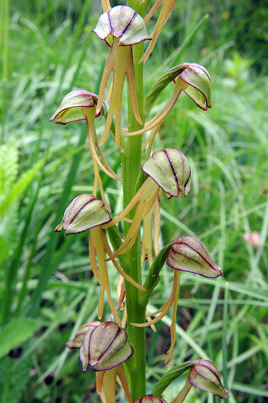 Im italienischen Sprachraum trägt die Pflanze den treffenden Namen 'Ballerina'. Informationen zur Pflanze: Art: Ohnsporn (Aceras anthropophorum). Verbreitung: Frankreich bis Südengland und Alpenländer, Nordafrika, Spanien, Balearen, gesamter Mittelmeerraum einschliesslich der Inseln bis zum Libanon. Regionale Verbreitung Alpen: Alpenvorland, Südalpen bis in Höhen von 1200 m, selten. Vorkommen: Warme, kalkreiche, trockenen bis mässig frische, lehmhaltige Böden - kurzgrasige Magerwiesen, Halbtrockenrasen, lichtes Gebüsch, im Windschutz von Hecken. Wuchshöhe: 20 - 30 cm. Blüte: Mai - Juni, Blütengrösse 1,2 - 1,4 cm. |