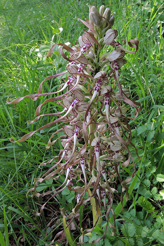 Die Blüten verströmen einen ziegenbockähnlichen Geruch. Informationen zur Pflanze: Art: Bocks-Riemenzunge (Himantoglossum hircinum). Verbreitung: Von Nordafrika, Süditalien über Spanien und Frankreich bis nach Belgien, Holland, Deutschland und Mittelengland. Regionale Verbreitung Alpen: Alpenvorland, in Höhen bis 1000 m, selten. Vorkommen: Warme, kalkreiche, sehr lockere, oft steinige Lehmböden - sonnige, gebüschreiche Trocken- oder Magerrasen, lichte Wälder, Böschungen, aufgelassene Weinberge oder Steinbrüche. Wuchshöhe: 30 - 80 cm. Blüte: Mai - Juni, Länge Mittellappen 3 - 6 cm, Länge Seitenlappen 1 - 1,5 cm. |
