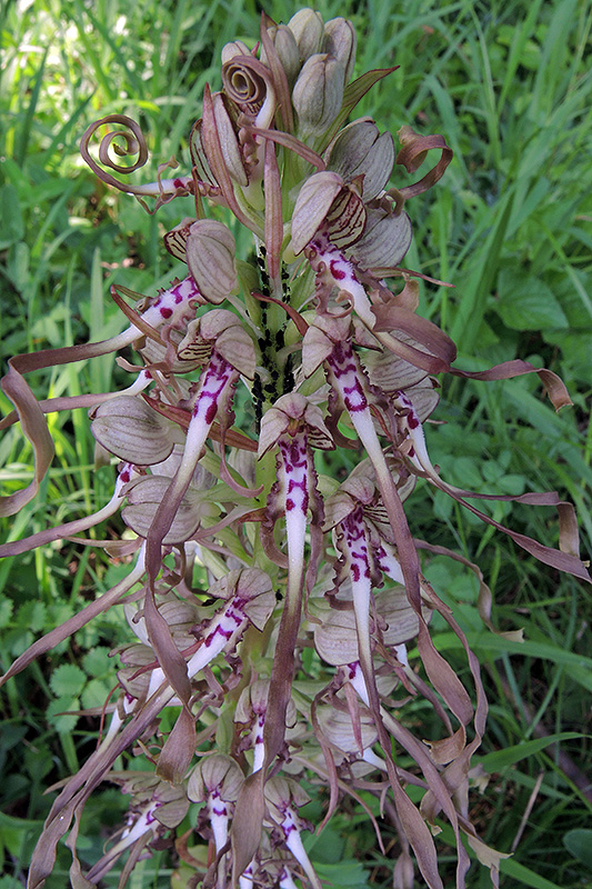 Der Blütenstand ist reichblütig, bei grösseren Pflanzen können es über 100 Blüten sein. Informationen zur Pflanze: Art: Bocks-Riemenzunge (Himantoglossum hircinum). Verbreitung: Von Nordafrika, Süditalien über Spanien und Frankreich bis nach Belgien, Holland, Deutschland und Mittelengland. Regionale Verbreitung Alpen: Alpenvorland, in Höhen bis 1000 m, selten. Vorkommen: Warme, kalkreiche, sehr lockere, oft steinige Lehmböden - sonnige, gebüschreiche Trocken- oder Magerrasen, lichte Wälder, Böschungen, aufgelassene Weinberge oder Steinbrüche. Wuchshöhe: 30 - 80 cm. Blüte: Mai - Juni, Länge Mittellappen der Lippe 3 - 6 cm, Länge Seitenlappen 1 - 1,5 cm. |
