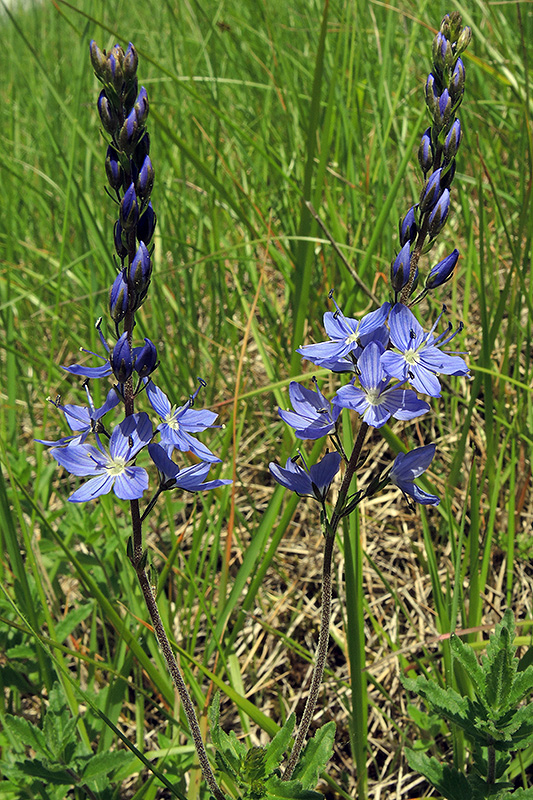 Die lang gestielten, vielblütigen Trauben des Grossen Ehrenpreises wiegen sanft im Wind. Informationen zur Pflanze: Art: Grosser Ehrenpreis (Veronica teucrium). Verbreitung: Mitteleuropa bis Balkan, östlich bis Ostsibirien und den Altai. Regionale Verbreitung Alpen: In Höhen bis 1700 m, zerstreut. Vorkommen: Warme, trockene, kalkhaltige Lehm- oder Steinverwitterungsböden - Gebüsche, Waldränder, lichte Wälder, Halbtrockenrasen. Wuchshöhe: 15 - 100 cm. Blüte: Mai - Juli, Durchmesser Blüte 1 - 1,3 cm. |