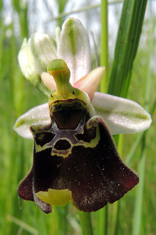 Die Nahansicht einer Blüte der Hummel-Ragwurz. Informationen zur Pflanze: Art: Hummel-Ragwurz (Ophrys holoserica). Verbreitung: Europäisch, mediterran, submediterran, nördlich bis Südengland, West- und Mitteldeutschland, Nordbayern, Südostösterreich. Regionale Verbreitung Alpen: Nördliche Kalkalpen in Höhen bis 1000 m, südliche Kalkalpen bis 1500 m, selten. Vorkommen: Tiefgründige, humusreiche Kalk- oder Lössböden - Magerwiesen, Halbtrocken- und Trockenrasen, grasige Dämme, buschige Hänge, lichte Föhren-Eichenwälder, trockenere Stellen von Feuchtwiesen. Wuchshöhe: 10 bis 30 cm. Blüte: Mai - Juli, Länge Sepalen (äussere Blütenblätter, Kelchblätter) 10 - 14 mm, Petalen (innere Blütenblätter, Kronblätter) 3 - 6 mm, Lippe 8 - 12 mm lang und 12 - 18 mm breit. |