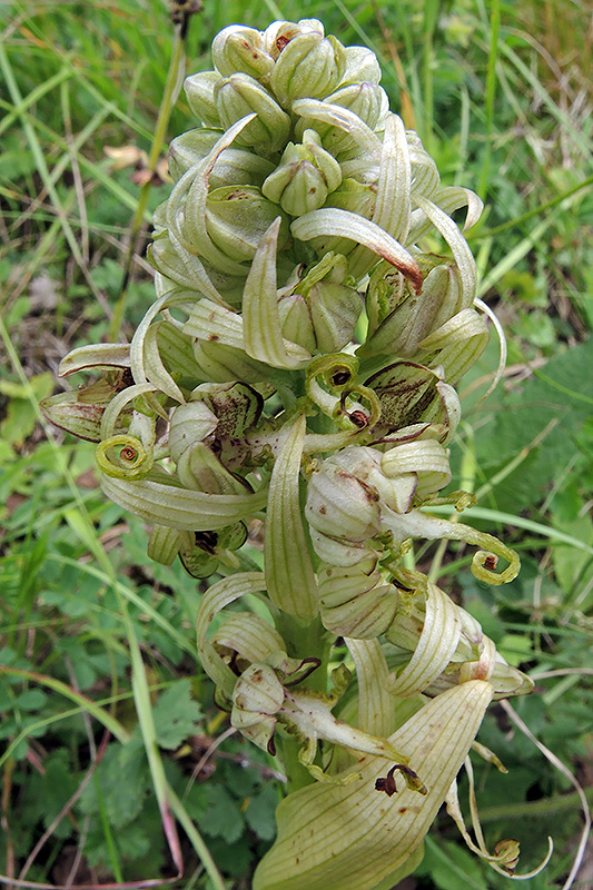 Ein Blütenstand öffnet sich gerade. Informationen zur Pflanze: Art: Bocks-Riemenzunge (Himantoglossum hircinum). Verbreitung: Von Nordafrika, Süditalien über Spanien und Frankreich bis nach Belgien, Holland, Deutschland und Mittelengland. Regionale Verbreitung Alpen: Alpenvorland, in Höhen bis 1000 m, selten. Vorkommen: Warme, kalkreiche, sehr lockere, oft steinige Lehmböden - sonnige, gebüschreiche Trocken- oder Magerrasen, lichte Wälder, Böschungen, aufgelassene Weinberge oder Steinbrüche. Wuchshöhe: 30 - 80 cm. Blüte: Mai - Juni, Länge Mittellappen 3 - 6 cm, Länge Seitenlappen 1 - 1,5 cm. |