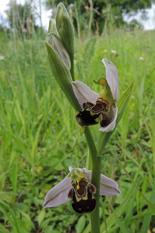 In der Magerwiese blüht die Bienen-Ragwurz in eindrücklicher Anzahl. Informationen zur Pflanze: Art: Bienen-Ragwurz (Ophrys apifera). Verbreitung: Portugal bis Georgien, nordwärts bis England, südwärts bis Nordafrika und Vorderasien, mit Verbreitungsschwerpunkt mediterranes Südeuropa. Regionale Verbreitung Alpen: Jura, Kalkalpen in Höhen bis 1000 m, sehr selten. Vorkommen: Tiefgründige, lockere, kalkhaltige Böden - Halbtrockenrasen, Magerwiesen, Gebüsche, lichte Trockenwälder. Wuchshöhe: 15 bis 30 cm. Blüte: Mai - Juli, Länge Sepalen (äussere Blütenblätter, Kelchblätter) 13 - 16 mm, Petalen (innere Blütenblätter, Kronblätter) 3 - 4 mm, Lippe 8 - 12 mm lang und 7 - 9 mm breit. |
