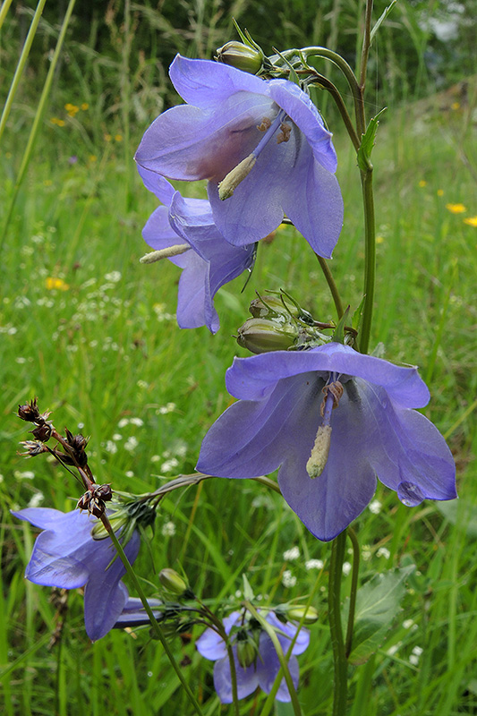 Die stattlichen Blüten der Rautenblättrigen Glockenblume wiegen sanft im schwachen Wind. Informationen zur Pflanze: Art: Rautenblättrige Glockenblume (Campanula rhomboidalis). Verbreitung: Westalpin-pyrenäisch. Regionale Verbreitung Alpen: Von den Seealpen bis ins Engadin, in Höhen bis 2300 m, selten. Im Jura bis zum Kanton Solothurn. Vorkommen: Kalkhaltige, nährstoffreiche, lehmige Böden - Feuchtwiesen, Matten. Wuchshöhe: 20 - 60 cm. Blüte: Juni - August, Länge Blüte bis 2 cm. |