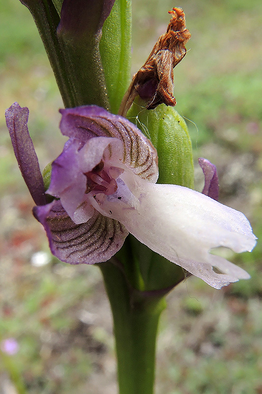 Die farblich recht variablen Blüten des Kleinen Knabenkrauts sind überwiegend purpurrot, seltener auch violett, rot, rosa, grünlich oder weiss. Kennzeichnend für die Art sind die dunklen Nerven der Perigonblätter. Informationen zur Pflanze: Art: Kleines Knabenkraut (Anacamptis morio, Syn. Orchis morio). Verbreitung: Europa, Nordafrika, Vorderasien und Kaukasien. Regionale Verbreitung Alpen: In Höhen bis 1500 m, verbreitet. Vorkommen: Mineralreiche, magere, ungedüngte, nicht zu trockene Böden - Magerrasen, Trockenrasen, mässig feuchte Wiesen, trockenere Bereiche von Feuchtwiesen, lichte Wälder. Wuchshöhe: 10 - 50 cm. Blüte: April - Juni, Lippe Länge bis 1 cm, Breite bis 1,6 cm. |