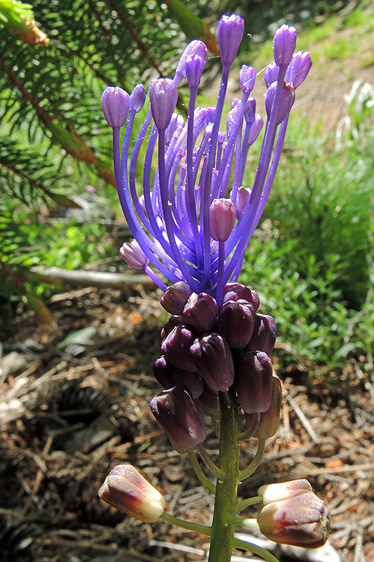 An der Spitze des Blütenstandes der Schopfigen Traubenhyazinthe befindet sich ein auffälliger Schopf zahlreicher blauvioletter, aufwärtsgerichteter, steriler Blüten. Darunter sind die röhrig-glockenförmigen, fertilen Blüten angeordnet. |