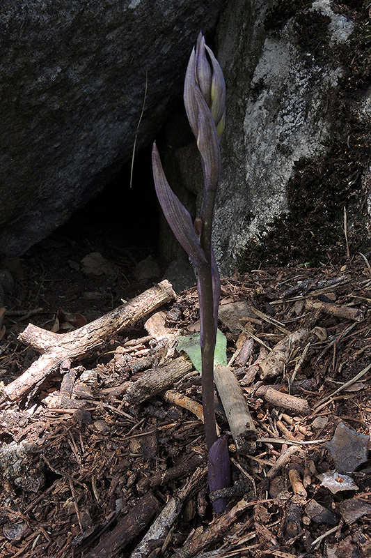 Die ganze Pflanze ist von trüb-violetter Farbe, die Blätter sind zu scheidenartigen Schuppen reduziert. Informationen zur Pflanze: Art: Dingel (Limodorum abortivum). Verbreitung: Das Hauptverbreitungsgebiet liegt im Mittelmeerraum. Nach Norden dringt der Dingel bis Belgien, Deutschland und Tschechien vor, nach Osten bis in den Kaukasus und Iran. Regionale Verbreitung Alpen: In Höhen bis 1600 m, selten. Vorkommen: Tiefgründige, kalkhaltige Böden, an Hitzestandorten - Magerrasen in Heckennähe, lichte, sommerwarme, trockene Föhren- und Flaumeichenwälder. Wuchshöhe: 20 - 80 cm. Blüte: Mai - Mitte Juli, Länge Sepalen (äussere Blütenblätter, Kelchblätter) bis 2 cm. |