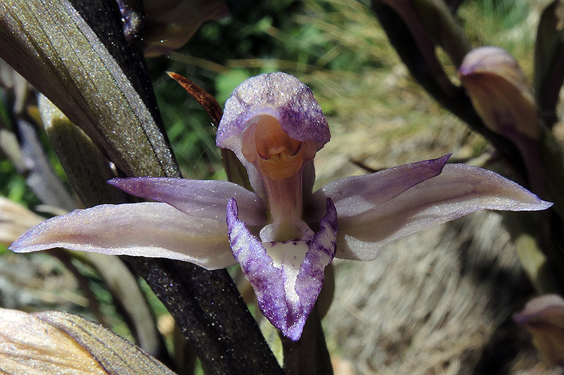Die herrlichen Blüten des Dingels sind nur bei gutem Wetter weit geöffnet. Informationen zur Pflanze: Art: Dingel (Limodorum abortivum). Verbreitung: Das Hauptverbreitungsgebiet liegt im Mittelmeerraum. Nach Norden dringt der Dingel bis Belgien, Deutschland und Tschechien vor, nach Osten bis in den Kaukasus und Iran. Regionale Verbreitung Alpen: In Höhen bis 1600 m, selten. Vorkommen: Tiefgründige, kalkhaltige Böden, an Hitzestandorten - Magerrasen in Heckennähe, lichte, sommerwarme, trockene Föhren- und Flaumeichenwälder. Wuchshöhe: 20 - 80 cm. Blüte: Mai - Mitte Juli, Länge Sepalen (äussere Blütenblätter, Kelchblätter) bis 2 cm. |