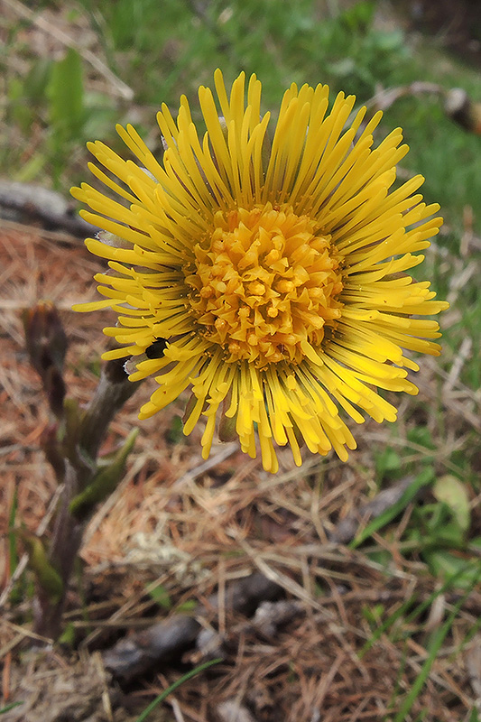 Auch der Huflattich gehört zu den ersten Frühjahrsblumen. Ein Blütenstand enthält etwa 300 weibliche, gelbe Zungenblüten und 30 bis 40 männliche, gelbe Röhrenblüten. |